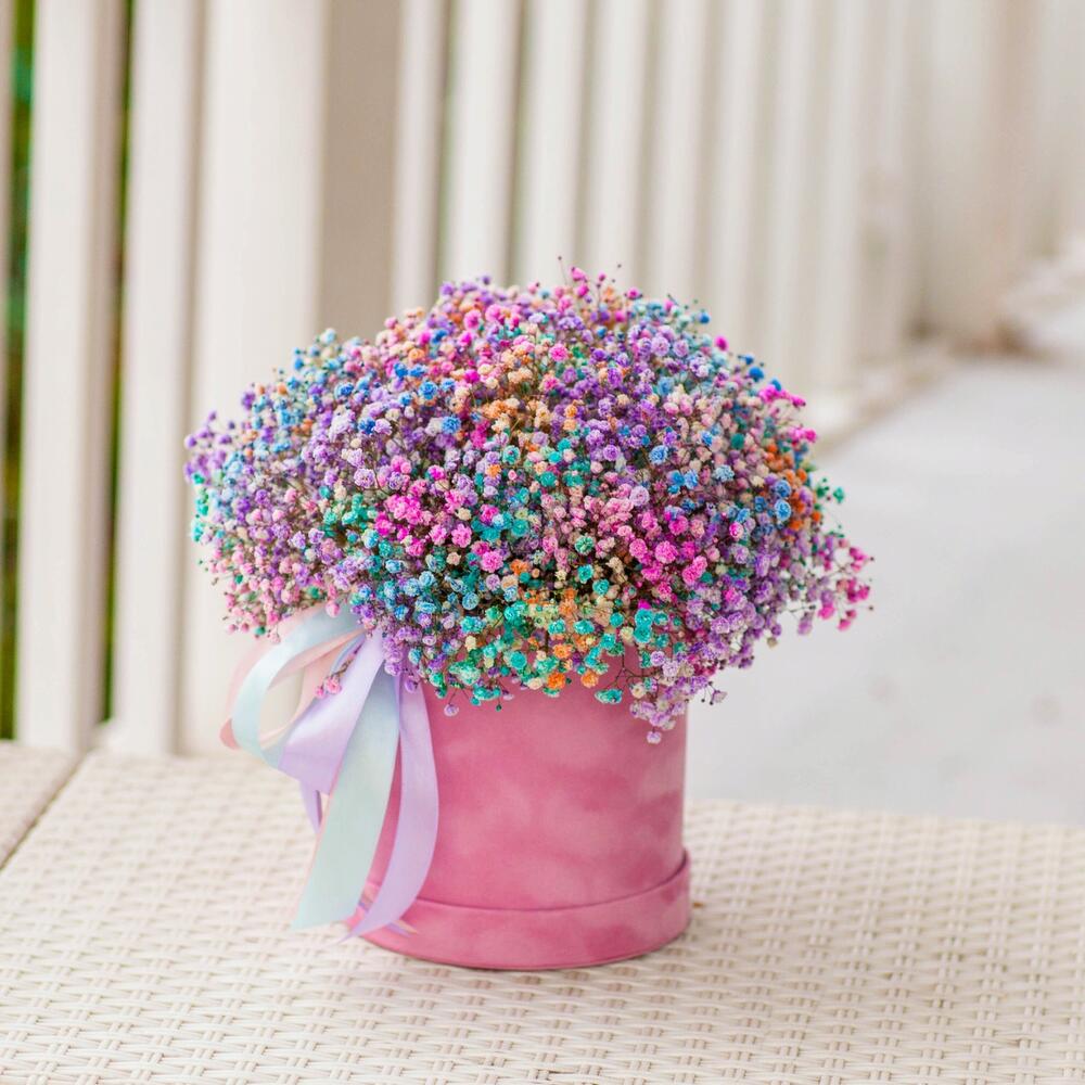 гипсофила радужная – 9 шт.Бархатная коробка – 1 шт.Оазис флористический – 1 шт.