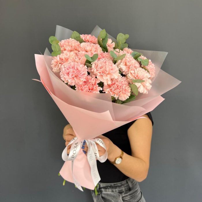 Эвкалипт – 1 шт.Атласная лента – 1 шт.Диантус сортовой – 17 шт.Дизайнерская упаковка – 1 шт.