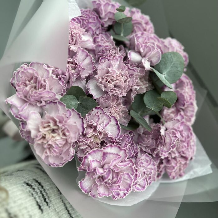25 фиолетовых гвоздик с эвкалиптом (букет N 31)