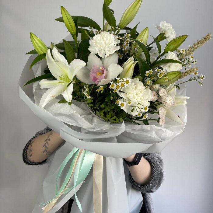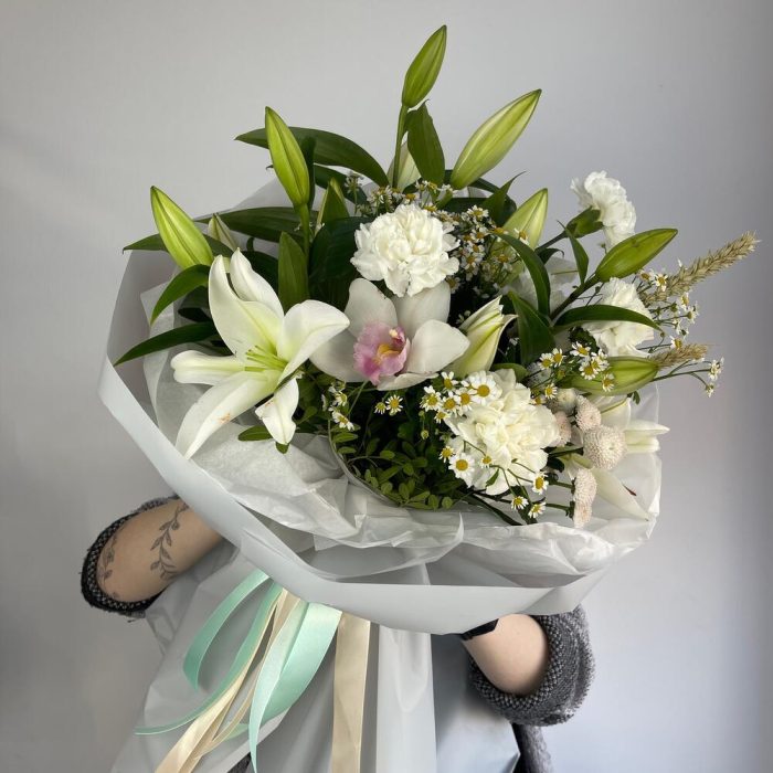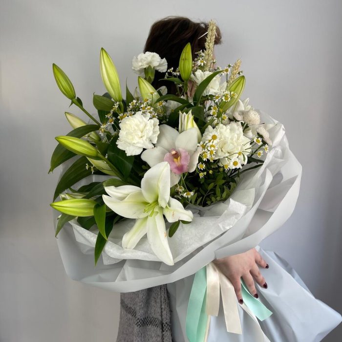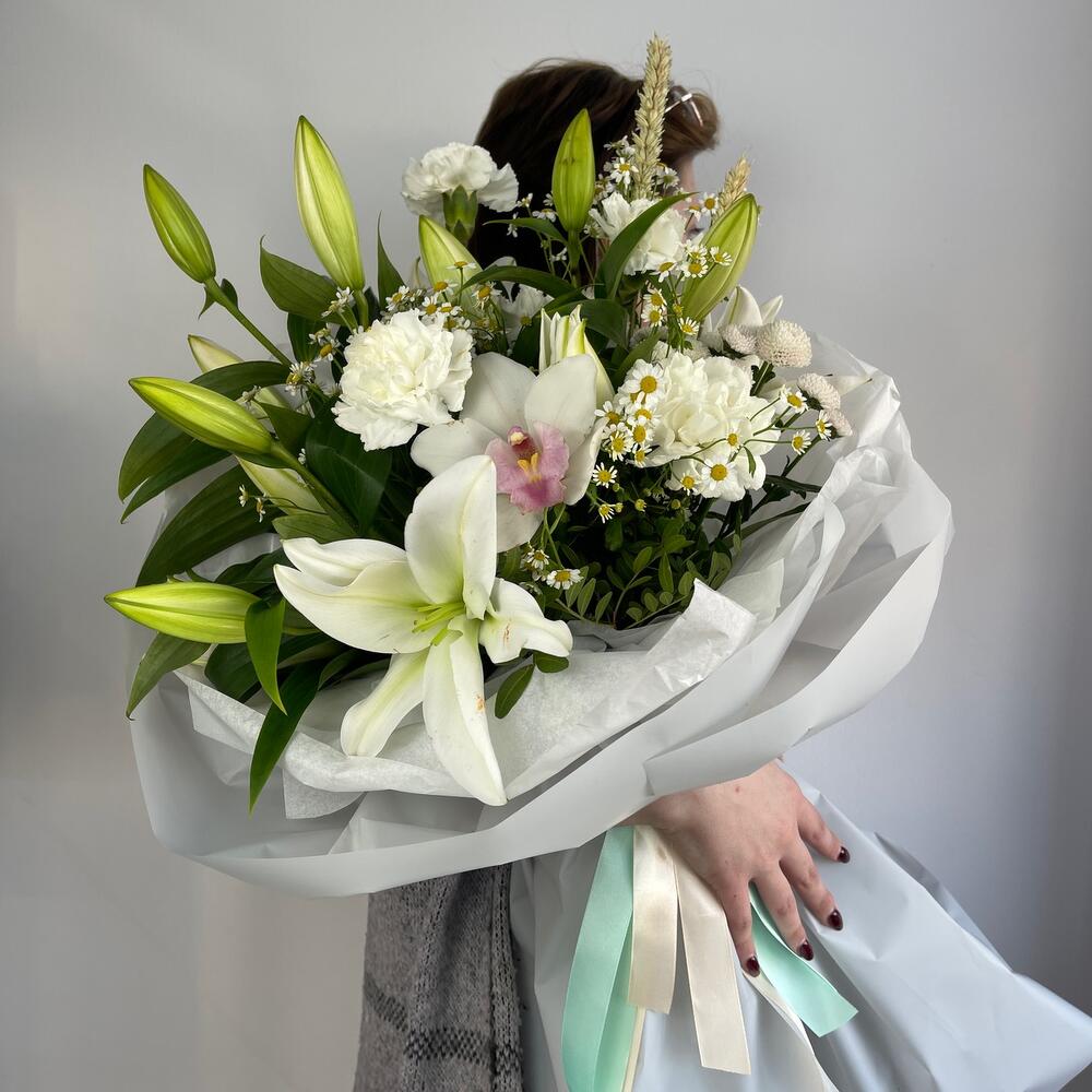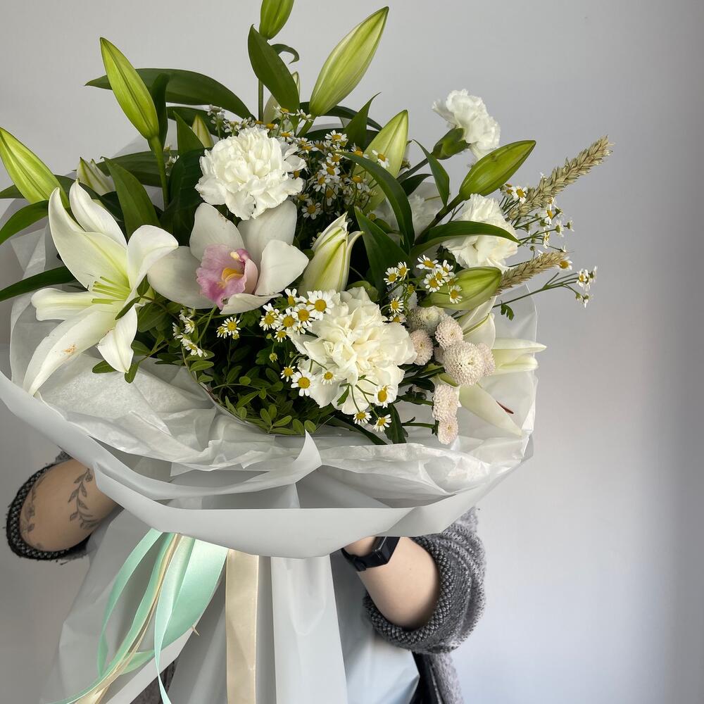 Лилия – 3 шт.Орхидея Цимбидиум – 1 шт.Лента атласная – 2 шт.Диантус – 5 шт.Матрикария – 4 шт.Сантини – 1 шт.Пшеница – 2 шт.Упаковка дизайнерская – 4 шт.Фисташка пучок – 1 шт.