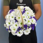 Кустовая ромашковая хризантема – 5 шт.Синяя статица – 2 шт.Корзина – 1 шт.