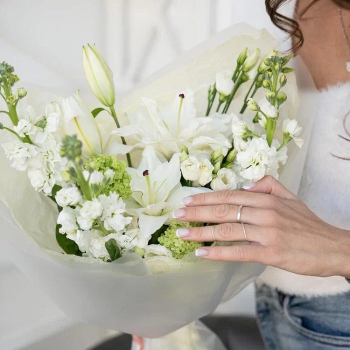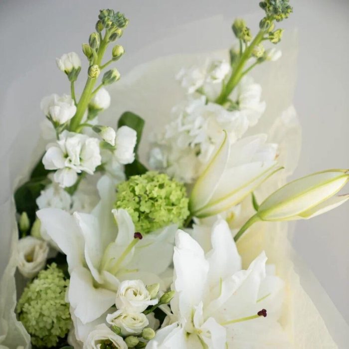 Вибурнум – 3 шт.Лизиантус – 3 шт.Маттиола – 3 шт.Лента атласная – 1 шт.Упаковка дизайнерская – 6 шт.лилия дабл – 1 шт.