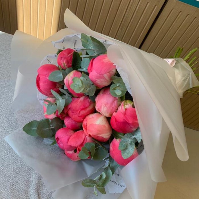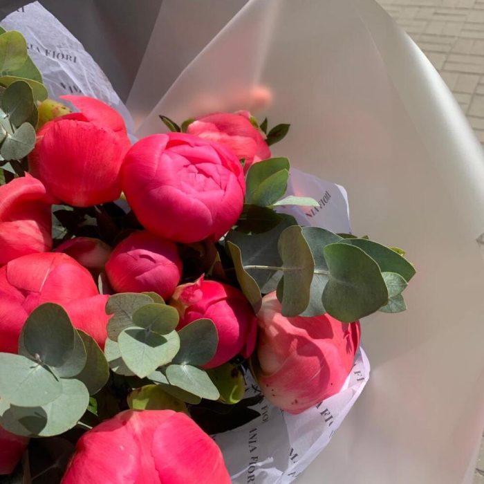 Эвкалипт – 1 шт.Подарочная упаковка – 1 шт.Пион coral sunset – 12 шт.Средство для продления жизни цветов – 1 шт.