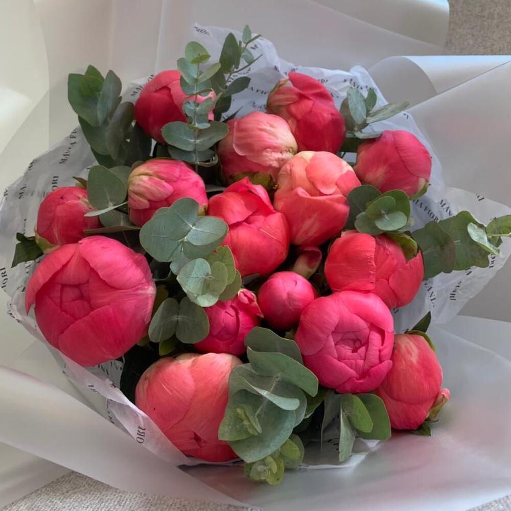 Яркий букет из эффектных пионов Coral sunset, которые потрясающе раскрываются и меняют цвет от ярко кораллового до нежно персикового