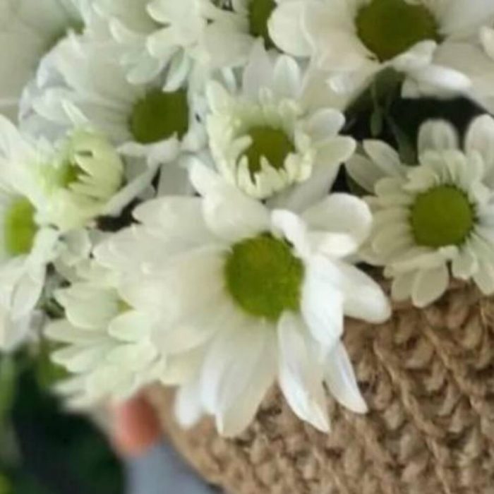 ромашки – 15 шт.вязанная корзина ручной работы – 1 шт.Флористическая губка – 1 шт.Лента атласная – 2 шт.