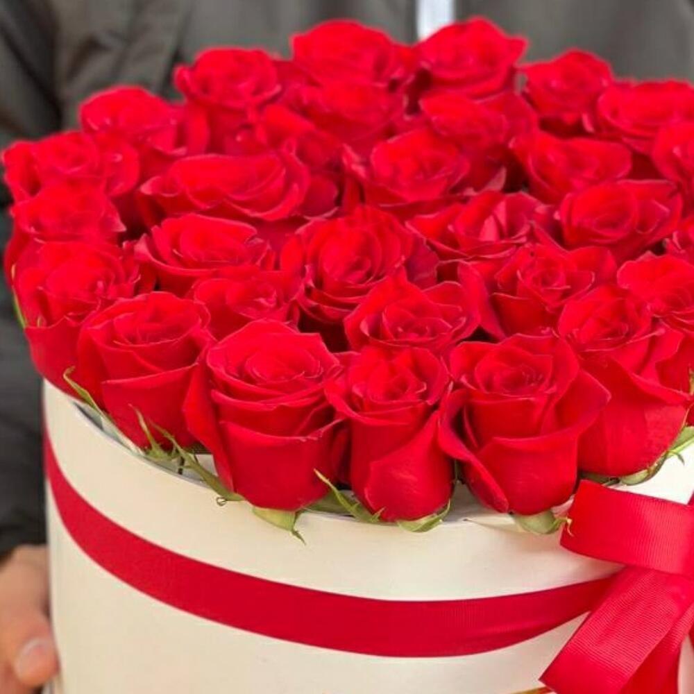 Лента атласная – 2 шт. Коробка шляпная – 1 шт. Роза голландия – 25 шт. Оазис флористический – 2 шт.