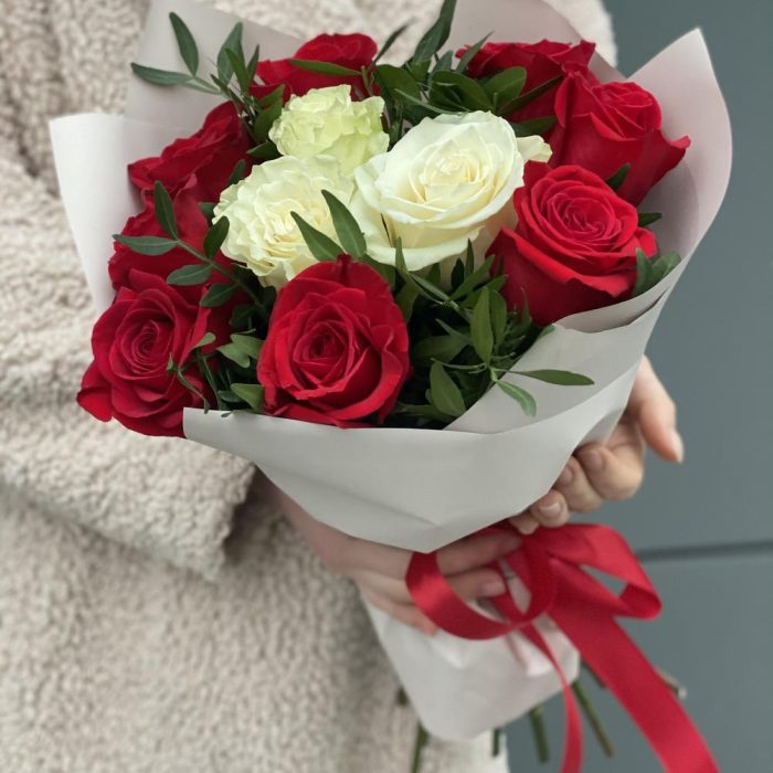 Роза белая – 3 шт. Роза красная – 8 шт. Оформление – 1 шт. Писташ – 5 шт.