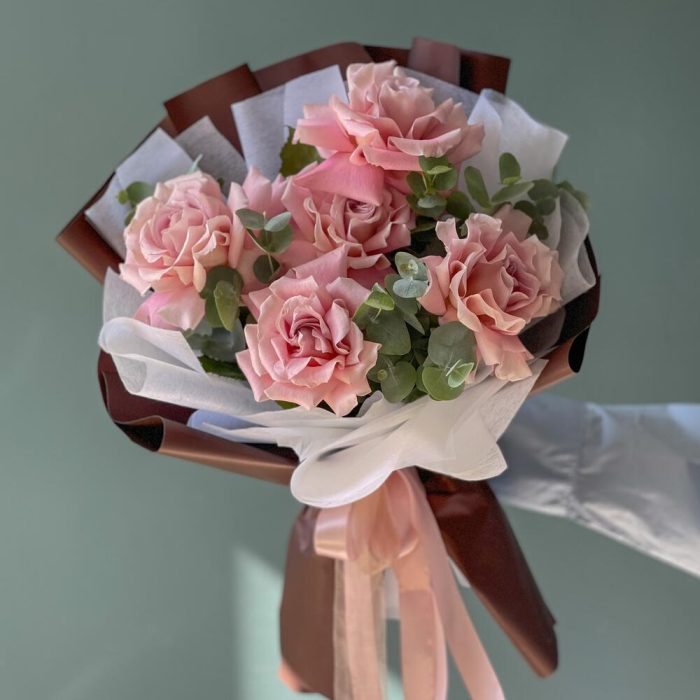 Лента – 2 шт.Эвкалипт – 2 шт.Роза одноголовая – 5 шт.Упаковка дизайнерская – 2 шт.
