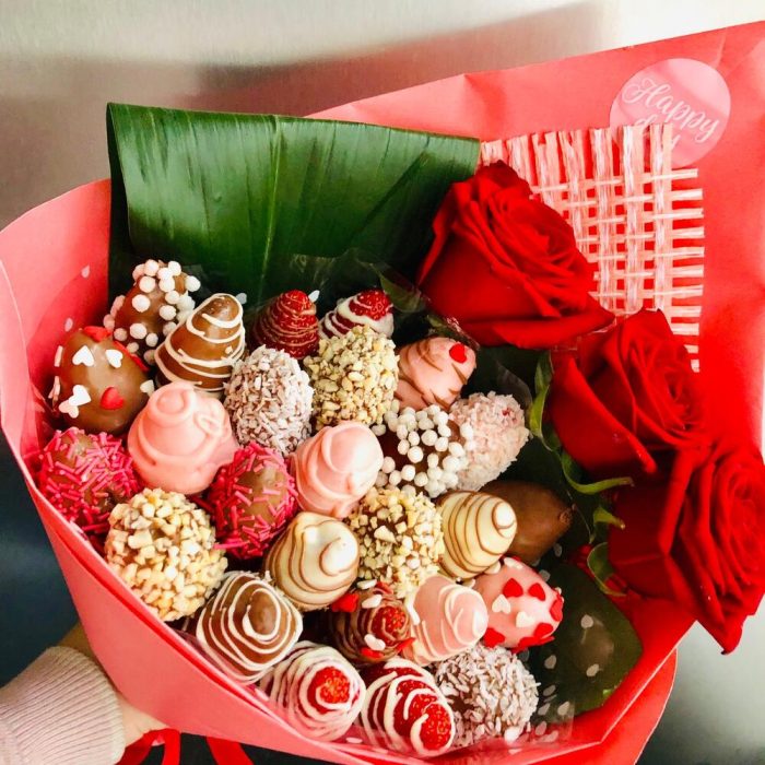 Аспидистра – 1 шт.Роза – 3 шт.Упаковка дизайнерская – 1 шт.Клубника в шоколаде – 500 гр.