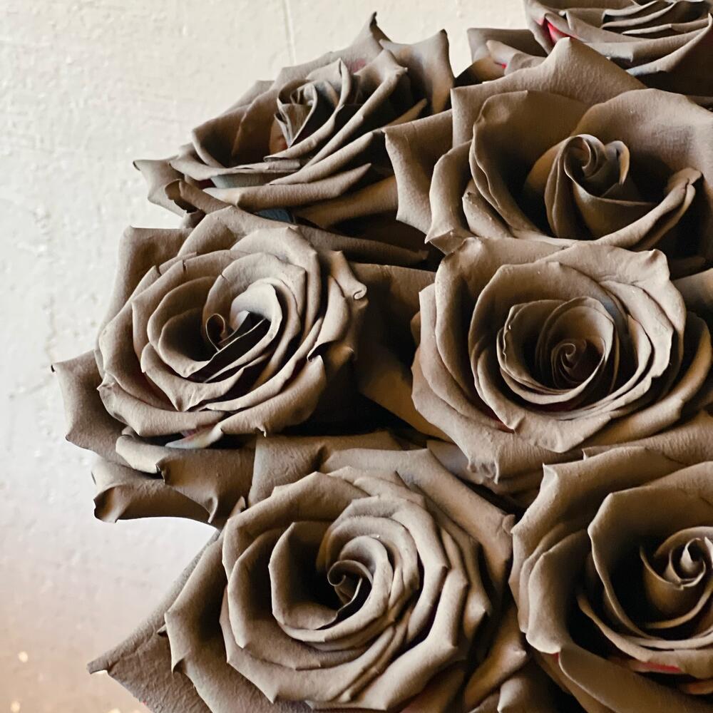 черные розы – 9 шт.Коробка шляпная – 1 шт.Тишью – 2 шт.Лента атласная – 1 шт.Оазис флористический – 1 шт.работа флориста – 1 шт.