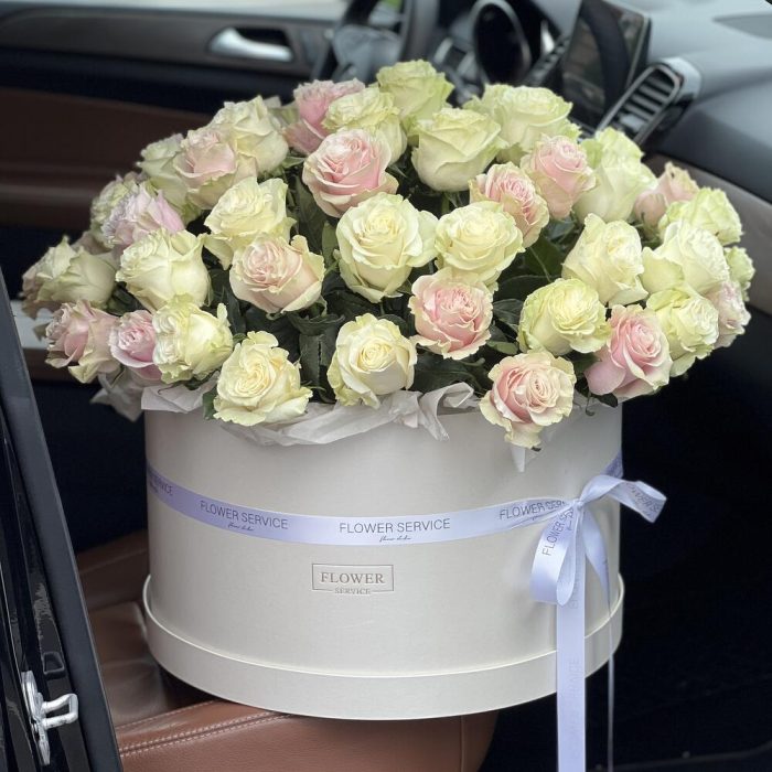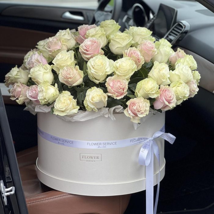 Оазис – 8 шт. Коробка – 1 шт. Оформление – 1 шт. роза белая и розовая – 75 шт.