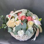 Роза кустовая – 3 шт.Диантус – 9 шт.Роза Мондиаль – 4 шт.Губка флористическая – 1 шт.роза канделайт – 3 шт.эвкалипт ветка большая – 2 шт.корзина плетеная ива средняя – 1 шт.