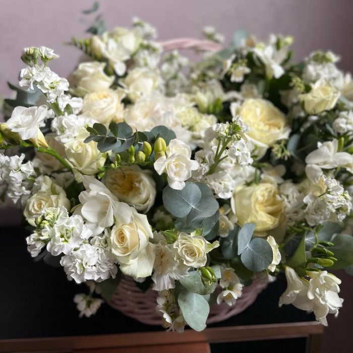 Роза – 21 шт.Пион – 1 шт.Роза пионовидная – 7 шт.Фрезия – 28 шт.Маттиола – 35 шт.Гвоздика – 15 шт.Эвкалипт – 13 шт.Корзина плетеная – 1 шт.Флористическая губка – 3 шт.