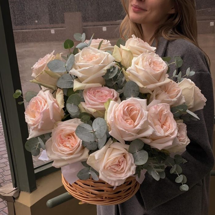 Роза пионовидная – 23 шт.Эвкалипт – 17 шт.Тишью – 2 шт.Корзина плетеная – 1 шт.