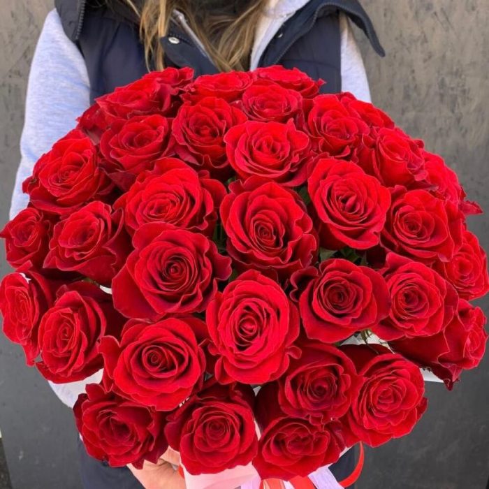 Роза красная – 41 шт.Коробка шляпная – 1 шт.Оазис флористический – 1 шт.
