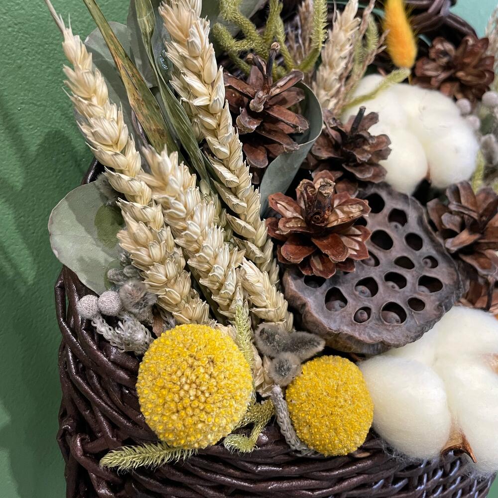корзина дорбаскет плетеная ручная работа – 1 шт.Хлопок натуральный – 3 шт.Шишки натуральные – 7 шт.Лотос сухой – 1 шт.Эвкалипт – 1 шт.Краспедия – 2 шт.Тритикале – 15 шт.сухоцветы микс – 1 шт.